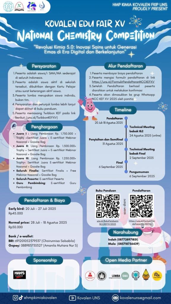 Halo calon peserta National Essay Competition (NEC) – KEF XV tahun 2025!! “Digitalisasi Pendidikan Sains Untuk Membangun Generasi Emas yang Berdaya Saing Global” HMP Kimia Kovalen dengan bangga mempersembahkan National Essay Competition, kompetisi tingkat nasional untuk menyalurkan bakat dan minat serta menumbuhkan kemampuan berpikir kritis dalam bentuk tulisan. NEC merupakan bagian dari rangkaian acara Kovalen Edu Fair XV. Kompetisi ini terbuka untuk seluruh mahasiswa/i dari berbagai perguruan tinggi di seluruh Indonesia.